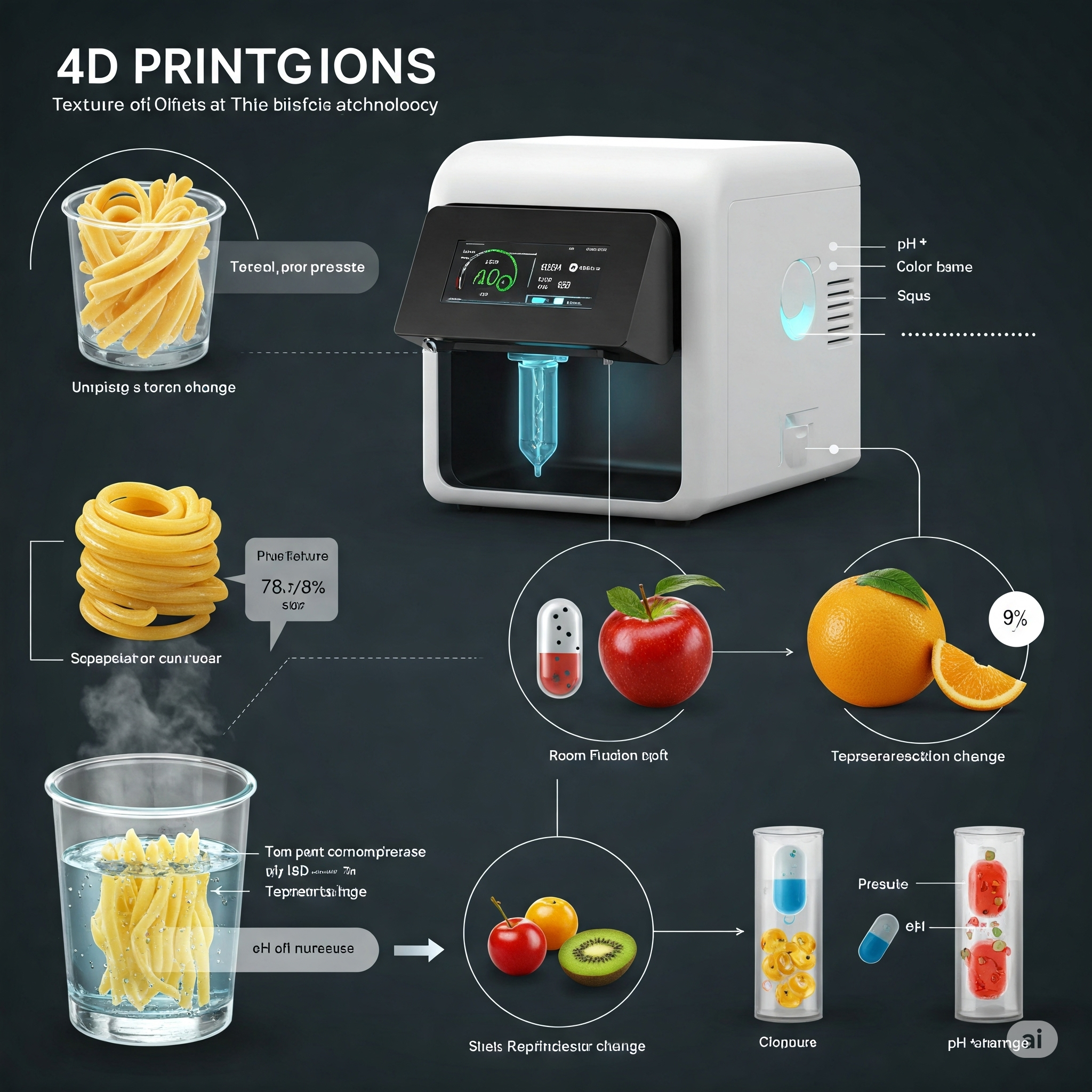 4B gıda baskı teknolojisinde, gıda ortamdaki nem, sıcaklık ve basınca göre özelliklerini değiştirir. Burada 3B baskıdan farklı olarak zaman faktörü vardır. Örnek verecek olursak;
