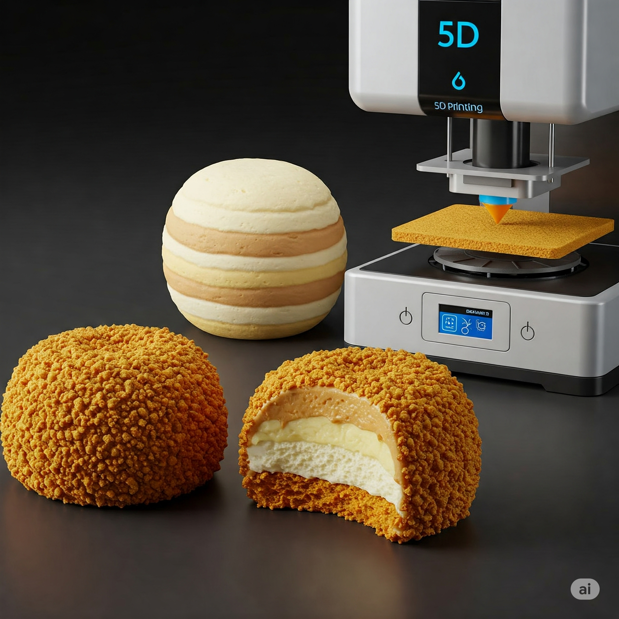 5B gıda baskısı, en karmaşık ve kavisli gıda yapılarını oluşturan güncel bir gıda teknolojisidir. Çok duyulu gıdaları üretmek için ek boyutlar ekleyerek baskı konseptini daha da ileri taşır. Değişen doku ve özellikteki (jel benzeri matris, mikro yapı gibi) gıda malzemelerini stratejik şekilde katmanlar. Örnek verecek olursak;