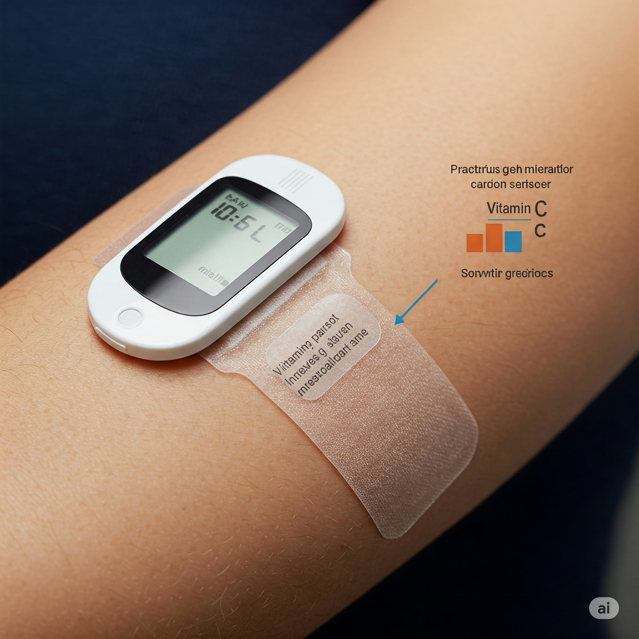 Bir başka giyilebilir sensör örneğini de Kaliforniya San Diego Üniversitesi’ndeki araştırmacılar geliştirmiştir. C vitamini sensörü içerdiği elektrot sensörü sayesinde terdeki C vitamini düzeyini hızla belirler. Bu sensör kullanıcı cildine yama şeklinde yapışır. Sensör, askorbat oksidaz enzimi içeren elektrotları sayesinde ortamdaki C vitaminini dehidroaskorbik aside dönüştürür. Böylece açığa çıkan oksijen, cihaz tarafından ölçülen bir akım üretir. Ayrıca araştırmacılar, gözyaşında ve tükürükte de bu elektrotun C vitamini değişimlerini test etmiştir. Böylece elektrotun çapraz işlevselliğini göstermişlerdir. Sonuç olarak araştırmacılar, cihazın kişisel beslenme uygulamalarında umut vadettiğini belirtmiştir.